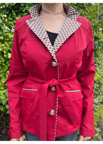 Бордовий якісний красивий легкий ошатний жакет (піджак) з м'якою підкладкою і з довгим бордовим поясом відмінно поєднується з будь-якими діловими штанами, джинсами, спідницею, сукнею. Двобортний прямий жакет з коміром допомагає мати розкішний і шикарний вигляд щодня. Підплічники створюють ідеальну посадку по плечах. Підборти мають цікавий унікальний малюнок із принтом. Жакет (піджак) легко застібається і розстібається на круглі металеві ґудзики. У застебнутому жакеті комірець перетворюється на комір стійку, а в розстебнутому – на відкладний комір. Глибокі місткі зовнішні прорізні кишені з листочкою та окантовкою допомагають завжди носити все потрібне з собою: в них поміщається абсолютно будь-який маленький підручний предмет. Базовий модний жакет (піджак) з довгими рукавами стане вашою паличкою-виручалочкою: в ньому можна ходити в школу, на випускний, на роботу. Це жакет куртка, жакет вітрівка. Тканина: легка плащівка. Сезони: літо, осінь, весна. Річ ідеально сидить по фігурі.