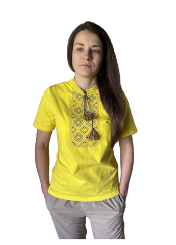 Жіноча футболка Lesia "Лісова пісня" з вишивкою червоного кольору. Барвистий орнамент доповнює традиційна українська геометрія. Яскраве і стильне вбрання для жінок, які люблять сміливі екперименти. Вишиванки пошиті з надзвичайно легкої та приємної на дотик тканини у пропорціях 95% віскоза/5% еластан. Ідеально сідають по фігурі, пропускають повітря, даючи шкірі дихати, не розтягуються і гарно перуться.