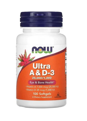 Вітамін А і D3 Now Foods (Ultra A & D3) являє собою комбінований продукт, що містить вітамін А (ретинол) і вітамін D3 (холекальциферол). Ці два вітаміни є важливими для підтримання здоров'я кісток, імунної системи та загального благополуччя. Кому рекомендується: Вітамін А і D3 Now Foods рекомендується для людей, яким потрібне додаткове поповнення запасів цих вітамінів в організмі. Він особливо корисний для людей з дефіцитом вітамінів A і D, а також для тих, хто шукає підтримку здоров'я кісток та імунної системи. Переваги складу: Здоров'я кісток: Вітамін D3 відіграє важливу роль у засвоєнні та засвоєнні кальцію і фосфору, що сприяє підтримці здоров'я кісток і зубів. Підтримка імунної системи: Обидва вітаміни А і D3 впливають на функцію імунної системи і можуть допомогти підтримувати її нормальне функціонування. Зір і здоров'я шкіри: Вітамін А необхідний для нормального зору і здоров'я шкіри. Він відіграє роль у підтримці здоров'я слизових оболонок і бере участь у регуляції росту та оновлення клітин. Рекомендації використання: Приймайте 1 капсулу вітаміну А і D3 Now Foods (25000 МО вітаміну А і 1000 МО вітаміну D3) один або два рази на день, переважно під час прийому їжі. Дотримуйтесь інструкцій на упаковці та проконсультуйтеся з лікарем, перш ніж почати прийом. Застереження: Не перевищуйте рекомендовану дозу вітамінів А і D, якщо не вказано інше. Якщо у вас є будь-які медичні стани або ви приймаєте інші ліки, проконсультуйтеся з лікарем перед використанням.