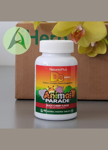 NaturesPlus, Source of Life, Animal Parade, вітамін D3, з натуральним вишневим смаком, без цукру, 12,5 мг (500 МО), 90 таблеток у формі тварин • Містить підсолоджувач ксилітол • Дієтична добавка для дітей у формі жувальних таблеток • Вегетаріанський продукт • Без глютену • Харчова підтримка для здоров'я кісток Потреба дітей у вітаміні D ніколи не була більшою. Використання крему для загару та сонцезахисного крему, а також заняття в приміщенні, як-от відеоігри та фільми на замовлення, різко зменшили перебування дітей на сонці, обмеживши природне джерело вітаміну D. Експерти рекомендують вживати додатковий вітамін D, зокрема біодоступну активну форму вітаміну D3, для оптимального росту та збереження здоров'я на довгий час. Animal Parade®, вітамін D3 500 МО для дітей у формі жувальних таблеток має приємний смак чорної вишні та цікаву форму тваринок, які люблять діти. Рекомендації із застосування В якості дієтичної добавки для дітей віком від двох років вживати по одній жувальній таблетці щодня. Призначений для дітей, починаючи з віку, в якому вони можуть безпечно розжовувати їжу, і старших. Інші інгредієнти Ксилітол, натуральний барвник (буряк), стеаринова кислота, лимонна кислота, натуральні ароматизатори, натуральні смаки вишні та малини, а також гуарова камідь. Не містить цукру, штучних барвників та консервантів. Не містить жодного з основних алергенів, зазначених Законом США про маркування харчових алергенів і захист прав споживачів. Містить підсолоджувач — ксилітол. Попередження Відповідає найсуворішим стандартам чистоти, включаючи пропозицію 65 штату Каліфорнія. Зберігати в щільно закритій упаковці в сухому та прохолодному місці. Зберігати в недоступному для дітей місці. Поживна цінність Розмір порції: 1 жувальна таблетка у формі тварини Кількість в 1 порції % від добової норми для дітей від 1 до 3 років % від добової норми для дорослих і дітей від 4 років Калорії 6 Всього вуглеводів 1 г < 1 %** < 1 %*** Всього цукру 0 г † † Ксилітол 1 г † † Вітамін D3 (холекальциферол) 12,5 мкг (500 МО) 83 % 63 % *** Відсоток від добової норми за умови споживання 1000 калорій на день. *** Відсоток від добової норми за умови споживання 2000 калорій на день. † Добову норму не визначено.