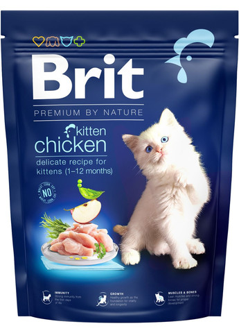 Повноцінний корм преміум-класу для кошенят (1-12 місяців), а також для вагітних або кішок, що годують. Смачний та апетитний корм з м'ясом курки та натуральними цінними інгредієнтами для щоденного здорового харчування вашого улюбленця. Особливості корму: • Для сильного імунітету з перших днів життя • Для правильного зростання, який стане фундаментом здорового та довгого життя • Для розвитку м'язів та міцних кісток • З м'якоттю яблука – натуральним джерелом клітковини • З розмарином, гвоздикою, куркумою та цитрусовими – натуральними антиоксидантами • З пребіотиками для делікатного та здорового травлення та відмінного засвоєння всіх компонентів. • Без пшениці, Без сої, Без кукурудзи Склад: курка дегідрована 40%, рис, курячий жир, горох, лосось дегідрований 4%, яблучна м'якоть сушена, гідролізована куряча печінка 2%, лососева олія 2%, сушений шпинат 0. 5%, мананолігосахариди (150 мг/кг), фруктоолігосахариди (120 мг/кг), Юкка Шідігера (80 мг/кг), сушений розмарин (12 мг/кг), сушена гвоздика (12 мг/кг), сушені цитрусові мг/кг), сушена куркума (12 мг / кг). Аналітичний склад: сирий білок 40. 0% сирий жир 18. 0%, вологість 2. 8% сира зола 8. 0%, сира клітковина 10%, 1 кальцій. 4% фосфор 1. 0% натрій 0. 5%, магній 0. 1%. Харчові добавки на 1 кг: вітамін (3a672a) 22000 МО, вітамін D3 (3a671) 900 МО, вітамін E (3a700) 700 мг, вітамін C (3a312) 300 мг, таурин (3a370) 2300 мг, 8 мг, цинк (3b606) 150 мг, марганець (3b504) 55 мг, залізо (3b106) 45 мг, мідь (3b406) 11 мг, йод (3b201) 3. 7 мг, селен (3b810) 0. 17 мг, L-метіонін (3c305) 4000 мг. Омега-3:0. 54%, Омега-6:2. 4%. Енергетична цінність: 3 930 ккал/кг. Рекомендації щодо годування: залежно від уподобань вихованця, корм можна давати сухим, змоченим водою або в поєднанні з вологим кормом Brit Premium. Рекомендований добовий розмір порції вказано у таблиці годівлі. Даючи новий корм вперше, змішуйте його протягом 3-5 днів із попереднім кормом, поступово збільшуючи співвідношення Brit Premium. Не забувайте давати своєму улюбленцеві свіжу питну воду.