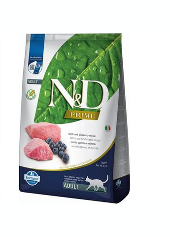 N&D GRAIN FREE PRIME CAT LAMB & BLUEBERRY ADULT 5kg Беззерновий сухий корм для дорослих кішок (ягня / чорниця), 5кгFarmina N & D Grain Free Feline Adult Lamb and Blueberry - це повноцінний сухий корм для дорослих кішок. Його ексклюзивна формула, що складається тільки з м'яса і без додавання злаків, замінена свіжими овочами та фруктами, дозволяє забезпечувати тварину необхідними поживними речовинами, покращуючи його самопочуття і здоров'я.Завдяки таким інгредієнтам, як свіжа італійська баранина і чорниця, які є джерелом натуральних волокон і антиоксидантів, ці крокети приносять тварині необхідну енергію. Використання тільки свіжих і якісних продуктів дозволяє задовольнити енергетичні потреби кішки і зробити їжу ще смачнішою, ідеальною навіть для самого вишуканого смаку кішок. Лінія сухих кормів Grain Free Natural & Delicious була розроблена для задоволення харчових потреб і смаків кішок, пропонуючи збалансовану кількість білків, вітамінів і мінералів, без додавання злаків, «без зерна».Склад: свіже м'ясо ягняти без кісток (28%), дегідратоване м'ясо ягняти (26%), картопля, курячий жир, зневоднені цільні яйця, свіжий оселедець, дегідратірований оселедець, риб'ячий жир, гідролізат тваринних білків, волокна гороху, сушена морква, сушена люцерна, інулін , фруктоолігосахаріди, маннанолігосахаріди, порошок чорниці (0,5%), дегідратований солодкий апельсин, порошок граната, зневоднені яблука, порошок шпинату, подорожник (0,3%), порошок чорної смородини, хлорид натрію, дріжджі сухі пивні, корінь куркуми (0 , 2%), глюкозамін, хондроїтин сульфат, екстракт календули (джерело лютеїну).Харчові добавки на кг.: Вітамін А 18000МО; Вітамін D3 1200МО; Вітамін Е 600мг; Вітамін С 300мг; Вітамін РР 150мг; Пантотенова кислота 50мг; Вітамін В2 20мг; Вітамін В6 8,1мг; Вітамін В1 10мг; Вітамін Н 1,5мг; Фолієва кислота 1,5 мг; Вітамін В12 0,1 мг; холіну хлорид 2500мг; бета-каротин 1,5мг; цинк 910мг; марганець 380мг; залізо 250мг; мідь 88мг; селенометіонін 0,40мг; DL-метіонін 5000мг; таурин 4000мг; L-карнітин 300мг. Спеціальні добавки: алое вера екстракт 1000 мг; екстракт зеленого чаю 100мг; Екстракт розмарину. Антиоксиданти: токоферол з екстрактів натурального походження.Поживні речовини: сирий білок - 42%; сирі жири і масла - 20%; сира клітковина - 1,80%; сира зола - 8,90%; кальцій - 1,60%; фосфор - 1,30%; магній - 0,11%; Омега-6 - 3,40%; Омега-3 - 0,90%; DHA - 0,50%; EPA - 0,30%; глюкозамін - 1200 мг / кг; хондроїтин сульфат - 900 мг / кг.Енергетична цінність: 4178 ККАЛ/КГ - 17,48 МДЖ/КГРозмір гранули: L-8-10 мм, H-3,5-5 мм.