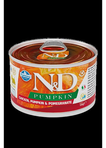 Farmina є піонером ринку консервованих вологих продуктів, застосовуючи технологію Multifiller, яка дозволяє дуже точно дозувати у банку кожен окремий інгредієнт за допомогою спеціальних дозаторів. Ця технологія дозволяє калібрувати шматки м'яса та розмір скибочок риби, щоб мати шматки потрібного вигляду та розміру. Процес повільного приготування на пару із сучасною стерилізацією їжі дозволяє зберегти органолептичні характеристики інгредієнтів. Щоб захистити благополуччя вашого вихованця та забезпечити принцип натуральності продуктів N&D, банки не містять BPA. Вироблено без загусників, стабілізаторів або карагінану: У вологих кормах Farmina N&D Prime, Pumpkin та Ancestral немає карагінанів та інших загусників, завдяки ексклюзивній виробничій системі. Всі вологі корми N&D не містять злаків або містять невелику кількість неселекціонованих злаків, які забезпечують поступове надходження енергії в організмі. Технології Farmina дозволяють виробляти мікробіологічно стерилізовані корми, які не потребують консервантів. Завдяки нижчому вмісту вологи, вологі корми N&D мають більш високий рівень сухої речовини! Усі корми Farmina – це результат наукових досліджень, спрямованих на благополуччя тварин. Склад: Курка (40%), оселедець, гарбуз (5%), варені курячі яйця, риб'ячий жир, солодка картопля, гранат (2%), фруктоолігосахариди, холіну хлорид, хондроїтин сульфат, глюкозамін, вітаміни, мінерали. Харчові добавки на кг: Вітамін А – 4000 МО; Вітамін D3 – 400 МО; Вітамін Е – 130 мг; Хелат цинку аналогічний метіонін гідроксилазі – 200 мг; Хелат марганцю аналогічний метіонін гідроксилазі – 40 мг; Хелат заліза гідрату гліцину – 70 мг; Хелат міді аналогічний метіонін гідроксилазі – 16 мг; Інактивовані пивні дріжджі – 1.10 мг; DL-метіонін – 1000 мг; Таурін – 500 мг; L-карнітин – 50 мг. Поживні речовини: Волога – 75.00%; сирий білок – 11.50%; сирі жири та олії - 5.50%; сира клітковина – 1.00%; сира зола – 1.80%. Енергетична цінність: EM Kcal/Kg 1056 - Mj/Kg 4.42