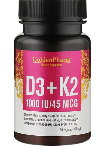 Ваша сила - це ваше здоров'я! «Голден-Фарм» створив вітаміни в капсулах для зміцнення загального імунітету і поліпшення фізичного стану. Вітаміни D3 + K2 №90 ефективно нормалізують роботу опорно-рухової системи, підвищують витривалість, дарують заряд бадьорості, енергії і сил. Вони рекомендовані спортсменам і тим, хто прагне зміцнити організм, незалежно від наявності або відсутності фізичної підготовки. Особливості Вітамінів D3 + K2 №90, 350 мг від «Голден-Фарм»: - забезпечують загальнозміцнювальну дію на організм;- покращують засвоєння кальцію і фосфору, сприяючи зміцненню кісток і зубів;- нормалізують згортання крові;- в упакуванні 90 капсул для застосування курсом;- забезпечують профілактичну дію;- не лікувальний препарат. Склад 1 капсули:- вітамін С (аскорбінова кислота): 3 mg (мг);- вітамін К2 (менахінон): 45 ?g (мкг);- вітамін D3 (холекальциферол) 1000 МО.