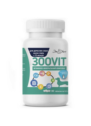 Вітамінно-мінеральний комплекс Зоовіт ЗооХелс для собак малих порід містять вітаміни, мінерали, мікро- та макроелементи для збагачення та збалансування щоденного раціону. Вітаміни мають привабливий смак і аромат, що дає можливість використовувати цю харчову добавку як корисні для здоров'я ласощі. До складу вітамінно-мінерального комплексу Зоовіт входять: фолієва кислота, необхідна в періоди швидкого розвитку організму – на стадії раннього внутрішньоутробного розвитку та перші місяці життя для зростання та розвитку кровоносної та імунної систем. Сухе знежирене молоко та суха сироватка містять вітаміни групи В, нікотинову кислоту, вітамін А, вітамін Е, біотин, фосфоліпіди, пробіотики, а головне – велика кількість кальцію, який зміцнює зуби, суглоби, кігті та шерсть, рекомендується для профілактики захворювань опорно-. Гідролізат курячої печінки – джерело тваринного білка із вмістом 21% сирого жиру та 59% сирого протеїну. Рибне борошно є цінним джерелом протеїну, амінокислот (лізин, треонін, метіонін, триптофан), поліненасичених жирних кислот Омега-3 та вітамінів (А, D3, Е), селену, йоду та фосфору, незамінних у процесі зростання та розвитку життєво важливих систем. Пивні дріжджі є джерелом вітамінів групи В, вітаміну РР, провітаміну D3, незамінних амінокислот, фосфору, селену та біологічно повноцінного білка для уникнення порушень обміну речовин та профілактики негативних наслідків незбалансованого харчування. Пшеничне борошно вищого ґатунку містить рослинні волокна, нормалізує та забезпечує стабільне функціонування шлунково-кишкового тракту тварин і є джерелом калію, магнію, фосфору та заліза. Особливості та переваги : сумісний з інгредієнтами кормів, лікарськими засобами та іншими кормовими добавками; підвищує активність тварин; доступна ціна; покращують зовнішній вигляд домашніх улюбленців; зміцнюють їхній імунітет; насичують організм корисними речовинами, необхідними для довгого та здорового життя. Застосування : молодим тваринам (кошенятам і цуценям) з 6-ти тижнів до 12 місяців для збагачення та збалансування раціону вітамінами, поживними речовинами, амінокислотами, мікро- та макроелементами, щоб уникнути порушень обміну речовин, профілактики негативних наслідків системи незбалансованого харчування, формування міцного опорно-рухового апарату; дорослим тваринам (кішкам і собакам малих, середніх і великих порід) з 12 місяців для профілактики порушення обміну речовин, збагачення і збалансування раціону вітамінами, поживними речовинами, амінокислотами, мікро- і макроелементами, уникнення негативних наслідків незбалансованого харчування, поліпшення функцій сечовивідної системи, покращення стану шкіри та хутра тварин, зміцнення нервової системи та імунітету. Рекомендоване дозування : добавку дають собакам з урахуванням їхньої ваги: тваринам вагою менш як 2 кг – щодня, 1 раз на добу перед годуванням по ½ таблетки; тваринам вагою 2-4 кг – щодня, 1 раз на добу перед годуванням по 1 таблетці; тваринам вагою 4-10 кг – щодня, 2 рази на добу перед годуванням по 1 таблетці; тваринам вагою понад 10 кг – щодня, 3 рази на добу перед годуванням по 1 таблетці; хворим, які видужують, вагітним і лакуючим тваринам добову дозу рекомендовано подвоїти. Курс застосування 14 – 30 днів. Повторний курс проводять щокварталу чи за призначенням ветер