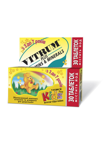 Склад: коричневий цукор, магнію фосфат двоосновний тригідрат, кальцію карбонат, аскорбінова кислота, натрію аскорбат, ніацинамід, заліза фумарат, стабілізатор – стеаринова кислота, DL-альфа-токоферолу ацетат, стабілізатор – кремнію діоксид, цинку оксид, ароматизатор натуральний полуничний (мальтодекстрин, цукор, натуральний ароматизатор полуниці, наповнювач – триацетин, антиокислювач – соєвий лецитин, стабілізатор – діоксид кремнію), стабілізатор – магнію стеарат, калію йодид, D-пантотенат кальцію, марганцю цитрат, рибофлавін, піридоксину гідрохлорид, тіаміну мононітрат, фолієва кислота, холекальциферол, ретинолу ацетат, D-біотин, барвник – заліза оксид червоний, міді карбонат, натрію селенат, ціанокобаламін. Рекомендації до споживання: вітамінно-мінеральний комплекс з 12 вітамінів та 9 мінералів в жувальних таблетках з приємним смаком полуниці може бути рекомендований для застосування в раціонах харчування дітей, як додаткове джерело вітамінів: A, D3, E, C, В1, B2, B6, B12, В3 (нікотинаміду), В5 (пантотенової кислоти), фолієвої кислоти, D-біотину та мінеральних речовин: кальцію, магнію, заліза, цинку, марганцю, міді, йоду, селену. Поповнення нестачі вітамінів та мінеральних речовин у дітей 3-7 років. Допомагає підтримувати оптимальний склад раціону харчування дитини, що сприяє: правильному фізичному та інтелектуальному розвитку дитини; зміцненню захисних сил організму дитини у сезон поширення застудних захворювань; підтримці оптимального функціонального стану нервової системи в період адаптації до дитячого садку. Застереження до споживання: не слід вживати дітям, які мають індивідуальну непереносимість компонентів продукту, порушення вуглеводного обміну. Жувальні таблетки не потрібно ковтати цілими. Давати дітям їх повинні дорослі. Приймати з іншими дієтичними добавками можна лише за рекомендацією лікаря. Прийом дієтичних добавок не замінює здоровий спосіб життя та повноцінне харчування. Перед споживанням слід проконсультуватися з лікарем-педіатром. Дітям, що мають захворювання щитоподібної залози, слід проконсультуватися з лікарем-ендокринологом. Не перевищуйте рекомендовану добову дозу. Не вживайте після закінчення строку придатності, зазначеного на упаковці. Не є лікарським засобом. Спосіб вживання та рекомендована добова доза: дітям від 3 до 7 років по 1 таблетці на добу під час вживання їжі. Тривалість споживання: 2-3 тижні. При необхідності можна повторити через місяць після узгодження з лікарем. 1 таблетка масою 1465 мг містить: Вітамін А 1888.0 мкг, Бета-каротин 112.0 мкг, Вітамін B1 1.5 мг, Вітамін В2 1.7 мг, Вітамін В3 20.0 мг, Вітамін В6 3.0 мг, Вітамін В12 6.0 мкг, Вітамін D3 10.0 мкг, Вітамін Е 30.1 мг, Вітамін C 60.0 мг, Пантотенова кислота 10.0 мг, Фолієва кислота 200.0 мкг, Біотин 30.0 мкг, Вітамін К1 10.0 мкг, Йод 150.0 мкг, Кальцій 200.0 мг, Калій 80.0 мг, Фосфор 48.0 мг, Магній 100.0 мг, Залізо 9.0 мг, Мідь 2.0 мг, Цинк 15.0 мг, Марганець 2.5 мг, Ванадій 10.0 мкг, Бор 0.150 мг, Селен 20.0 мкг, Молібден 25.0 мкг, Хром 100.0 мкг, Хлор 72.0 мг