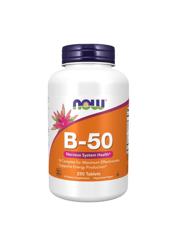 Здоров’я нервової системи Комплекс вітамінів групи В для максимальної ефективності Підтримка виробництва енергії Без ГМО Дієтична добавка Вегетаріанський і веганський продукт Кошерний продукт Сімейне підприємство, засноване в 1968 році Халяльний продукт Виготовлено на підприємстві, що має реєстрацію належної виробничої практики (GMP) Таблетки B-50 містять повний набір вітамінів групи B, а також холін і інозитол. Ці вітаміни сприяють виробленню енергії, нормальному метаболізму гомоцистеїну, а також зміцнюють здоров’я нервової системи. Вітаміни групи B водорозчинні й, за винятком вітаміну B12, не можуть накопичуватися в організмі, тому їх запаси потрібно щоденно поповнювати. Вітамін В12 накопичується в печінці. Майже всі джерела цього вітаміну мають тваринне походження (м’ясо та молочні продукти), тому прийом харчової добавки з вітаміном B12 може бути особливо важливим для вегетаріанців. Рекомендації із застосування Приймати по 1 таблетці на день під час їди.