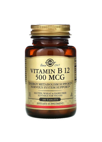 ОПИС У нормі Вітамін В12 або ціанокобаламін накопичується в печінці та його вистачає надовго, але з віком, у післяопераційний період, під час приймання препаратів від печії, хвороб шлунково-кишкового тракту, веганства - організм може відчувати дефіцит. Цей вітамін бере участь у формуванні еритроцитів, розвитку нейронів і синтезі ДНК. Тому незамінний під час профілактики анемії та нейродегенеративних порушень. Його складно отримати з рослинних продуктів, найбільше В12 міститься в продуктах тваринного походження: печінці, серці, яловичині, лососеві, яйцях, молочних продуктах. Особливо його потребують: вегани та вегетаріанці зі стажем; люди зі зниженою кислотністю шлунка, синдромом подразненого кишечника; люди, старші за 50 років; люди, хворі на СНІД; ті, хто хворіє на діабет. РЕКОМЕНДАЦІЇ Як харчову добавку для дорослих приймати одну (1) таблетку на день, бажано під час їди або за вказівкою лікаря. СКЛАД Порція: 1 таблетка. Вітамін B12 (у формі ціанокобаламіну) 500 мкг 20 830% Кальцій 130 мг 10% СН - добова норма Інші інгредієнти: мікрокристалічна целюлоза, фосфат дикальцію, рослинна целюлоза, рослинна стеаринова кислота, діоксид кремнію, рослинний стеарат магнію. Не містить глютену, пшениці, молочних продуктів, сої, дріжджів, цукру, натрію, штучних ароматизаторів, консервантів і барвників. ПОПЕРЕДЖЕННЯ У разі вагітності, годування груддю, приймання будь-яких медичних препаратів або будь-яких захворювань слід проконсультуватися з лікарем перед вживанням будь-яких харчових добавок. У разі появи будь-яких побічних ефектів припинити застосування і звернутися до лікаря. Зберігати в недоступному для дітей місці. Зберігати за кімнатної температури. Не використовувати, якщо флакон не запечатаний.