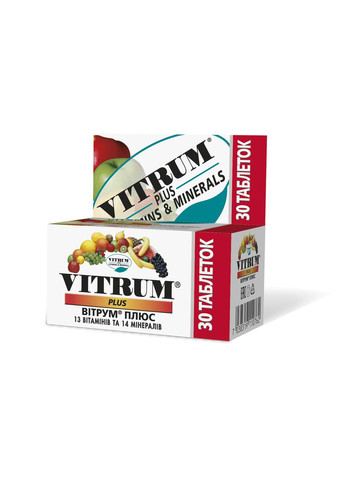 Додаткове джерело 13 вітамінів та 14 мінералів для балансу харчового раціону дорослих, що сприятиме підтримці нормального метаболізму та функції імунної системи, у тому числі під час поширення сезонних захворювань Поєднання 13 вітамінів та 14 мінералів збалансує Ваше харчування. Здорове харчування сприяє зниженню ризику розвитку гіповітамінозу та недостатності мінеральних речовин, підтримці нормального метаболізму та нормальної функції імунної системи, у тому числі під час поширення сезонних захворювань. 1 таблетка масою 1485 мг (mg) містить: Вітамін А 1,72 мг (mg) Кальцій 162,0 мг (mg) Вітамін B1 1,5 мг (mg) Магній 100,0 мг (mg) Вітамін В2 1,7 мг (mg) Калій 40,0 мг (mg) Вітамін В3 20,0 мг (mg) Хлор 36,3 мг (mg) Вітамін В6 2,0 мг (mg) Фосфор 125,0 мг (mg) Вітамін В12 6,0 мкг (µg) Залізо 16,0 мг (mg) Вітамін D3 10,0 мкг (µg) Мідь 2,0 мг (mg) Вітамін Е 20,1 мг (mg) Цинк 15,0 мг (mg) Вітамін C 60,0 мг (mg) Марганець 2,5 мг (mg) Вітамін К1 0,025 мг (mg) Селен 25,0 мкг (µg) Пантотенова кислота 10,0 мг (mg) Хром 25,0 мкг (µg) Фолієва кислота 400 мкг (µg) Молібден 25,0 мкг (µg) Біотин 30,0 мкг (µg) Ванадій 10,0 мкг (µg) Йод 150,0 мкг (µg) Склад: кальцію фосфат двоосновний безводний; магнію оксид; наповнювач: целюлоза мікрокристалічна; стабілізатор: кислота стеаринова; калію хлорид; кислота аскорбінова; заліза фумарат; DL-альфа-токоферолу ацетат; стабілізатор: магнію стеарат; оболонка таблетки: Opadry II White 177U180042 (рисовий крохмаль, ізомальт, метилцелюлоза, середньоланцюгові тригліцериди); стабілізатор: натрію кроскармелоза; антиспікаючий агент: кремнію діоксид; ніацинамід; цинку оксид; D-пантотенат кальцію; ретинолу ацетат; марганцю сульфат моногідрат; фолієва кислота; холекальциферол; D-біотин; піридоксину гідрохлорид; філохінон; міді оксид; хрому хлорид; тіаміну нітрат; рибофлавін; калію йодид; натрію селенат; натрію молібдат; натрію метаванадат; ціанокобаламін. Строк придатності: 2 роки від дати виробництва Застереження до споживання: не слід застосовувати людям, які мають індивідуальну непереносимість компонентів продукту, вагітним жінкам або жінкам, які годують груддю. Особам, що мають захворювання щитоподібної залози, слід проконсультуватися з лікарем-ендокринологом. Цей продукт не призначений для діагностики, лікування або попередження будь-яких хвороб, не повинен використовуватися як замінник різних дієт. Не перевищуйте рекомендовану добову дозу. Не вживайте після закінчення строку придатності, зазначеного на упаковці. Перед споживанням рекомендована консультація лікаря. Не є лікарським засобом. Спосіб вживання та рекомендована добова доза: дорослим по 1 таблетці на добу під час прийому їжі, запиваючи склянкою води. Тривалість споживання: 3 тижні, в подальшому термін споживання узгоджується з лікарем.