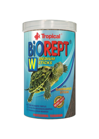 Biorept W — це багатокомпонентний корм, призначений для щоденного годування всеїдних і плотоїдних земноводних і водних черепах. Містить добавку ракоподібних, зокрема гамаруса, що збагачує корм цінним білком, хітином і поліненасиченими жирними кислотами (омега-3 та омега-6). Добавка цеоліту сприятливо впливає на травну систему та видалення токсинів з організму.