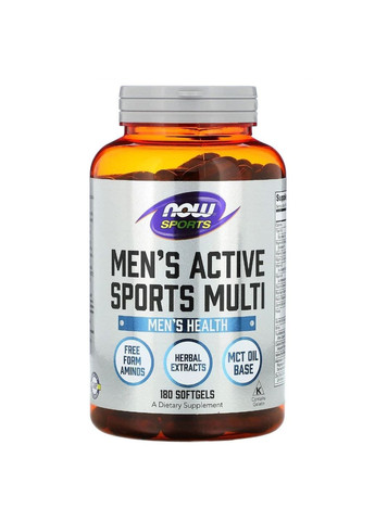 Men's Active Sports Multi від Now Foods призначений для активних чоловіків, які прагнуть зміцнювати своє здоров'я та фізичну форму за сприянням якісного та повного набору поживних речовин Розмір порції: 3 гелеві капсули Кількість порцій: 30 В одній порції % від добової потреби** Калорії 25 Всього жирів 2,5 г 3% Насичені жири 1,5 г 8% Вітамін А (бета-каротин) 1500 мкг 167% Вітамін С (аскорбінова кислота) 120 мг 133% Вітамін D-3 (холекальциферол) 25 мкг (1000 IU) 125% Вітамін Е (d-альфа-токоферолу сукцинат) 67 мг 447% Вітамін К (менахінон та фітонадіон) 45 мкг 38% Тіамін (вітамін В-1) (від тіаміну HCl) 50 мг 4167% Рибофлавін (вітамін В-2) 50 мг 3846% Ніацин (ніацигнамід) 40 мг 250% Вітамін B-6 (піридоксин HCl) 50 мг 2941% Фолат 680 мкгDFE (400 мкг фолієвої кислоти) 170% Вітамін B-12 (метилкобаламін) 1000 мкг 41667% Біотин 300 мкг 1000% Пантотенова кислота (кальцій пантотенат) 50 мг 1000% Кальцій (карбонат кальцію (мінеральний комплекс Aquamin® із морських водоростей)) 50 мг 4% Магній (аспартат магнію, цитрат магнію та мінеральний комплекс Aquamin®, з морських водоростей) 25 мг 6% Йод (йодид калію) 225 мкг 150% Цинк (бісгліцинат цинку (TRAACS®), моно-L-метіонін цинку та аспартат цинку] 15 мг 136% Селен (комплекс гліцинат селену Albion®) 200 мкг 364% Мідь (бігліцинат міді TRAACS®) 2 мг 222% Марганець (бігліцинат марганцю TRAACS®) 2 мг 87% Хром (піколінат хрому) 200 мкг 571% Молібден (натрій молібдат) 75 мкг 167% Олія із середньоланцюжковими тригліцеридами (MCT) 1500 мг * Суміш амінокислот: L-лейцин, L-ізолейцин, L-валін, L-глютамін, L-аргінін, таурин (все у вільній формі) 175 мг * Якірці стелиться (екстракт) 100 мг * ЗМА (комплекс цинку Mono-L-метіоніну, магній/цинк аспартат, піридоксин гідрохлорид) 100 мг * Фітостерольні ефіри CardioAid®-S (бета-ситостерол, кампестерол та стигмастерол) 100 мг * Екстракт женьшеню (корінь) 100 мг * Маку (корінь) 50 мг * Екстракт зеленого чаю (листя) 50 мг * Со пальметто (екстракт) 50 мг * Альфа-ліпоєва кислота 50 мг * Концентрат алое віра 50 мг * Лютеїн (екстракт чорнобривців) 500 мкг * Лікопін (натуральний томатний екстракт) 500 мкг * *Добова потреба не визначена. ** Відсоток від добової потреби заснований на дієті в 2000 калорій.