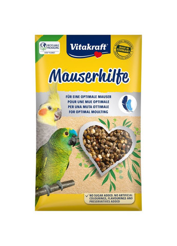 Підживлення Vitakraft для середніх і великих папуг у період линяння збагачене речовинами, необхідними в періоди проходження линяння. Ця добавка спрощує зміну пір'я, а також покращує колір нового пера. Склад: зерно, мінеральні речовини, пекарські домішки, насіння, дріжджі, молоко, цукор, мед, жири, олії, протеїн 19,9%, жири 21,4%, 20% клітковини, 14,3% зола, 6,4% вологи. Рекомендації щодо застосування: щодня додавати в корм під час линяння (по щіпці). Фасування: 25 г