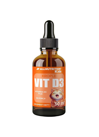Здоров'я та правильний розвиток дитини - пріоритет кожного з батьків! ALLNUTRITION KIDS VIT D3 дієтична добавка у краплях, спеціально розроблена для дітей молодшого віку. Містить вітамін D3, необхідний для міцних кісток, імунітету та правильного розвитку організму. Підходить для дітей віком від 3 років. ЧОМУ ALLNUTRITION KIDS VIT D3? ПІДТРИМКА ЗДОРОВ'Я КІСТОК І ЗУБІВ Вітамін D3 підтримує здоров'я кісток, що надзвичайно важливо в період інтенсивного росту дитини. Він також допомагає підтримувати здорові зуби та сприяє засвоєнню кальцію і фосфору. СТІЙКІСТЬ НА НАЙВИЩОМУ РІВНІ Вітамін D3 відіграє ключову роль у функціонуванні імунної системи. ЗРУЧНА ФОРМУЛА В КРАПЛЯХ Однієї краплі на день достатньо, щоб забезпечити дитину достатньою дозою вітаміну D3. Її можна додавати у воду, улюблений напій або давати безпосередньо на чайній ложці. Дбайте про здоровий розвиток та імунітет вашої дитини щодня! ПІДТРИМКА ЗДОРОВ'Я КІСТОК І ЗУБІВ СТІЙКІСТЬ НА НАЙВИЩОМУ РІВНІ 200% ДОБОВОЇ НОРМИ ВІТАМІНУ D ВІД *RWS ЗРУЧНА ФОРМУЛА В КРАПЛЯХ - 120 ПОРЦІЙ ПІДХОДИТЬ ДЛЯ ВЕГАНІВ ДЛЯ ДІТЕЙ СТАРШЕ 3 РОКІВ Поживна цінність: 0,25 мл (1 порція) Вітамін D 10 мкг / 200%* РВС – середня референсна величина добового споживання Склад: соняшникова олія, вітамін d (холекальциферол), антиоксидант: альфа-токоферол Рекомендоване порціонування Застосовувати по 1 краплі на день, відмірявши порцію в чайну ложку або додавши у воду чи інший напій. Перед вживанням збовтати. Продукт підходить для дітей віком від 3 років. Підходить для вегетаріанців. Не вживати, якщо у вас алергія (підвищена чутливість) до будь-якого з інгредієнтів продукту. Не перевищувати рекомендовану добову дозу. Харчова добавка не повинна використовуватися як заміна (сурогат) різноманітного раціону харчування. Рекомендується збалансоване харчування та здоровий спосіб життя. Утворення осаду є природним явищем. Завжди закривайте контейнер після використання.