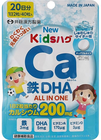 Жувальні вітаміни зі смаком шипучого сидору. Все необхідне для здорового розвитку вашої дитини в одному продукті! Цей продукт забезпечує дитячий організм важливими поживними речовинами, необхідними для росту та розвитку. Основні компоненти (у добовій дозі): - Кальцій: 200 мг - Залізо: 3 мг - DHA: 5 мг - Вітамін A: 170 мкг - Вітамін D: 3 мкг Переваги продукту: - Сприяє здоровому росту кісток та зубів: Завдяки кальцію забезпечується належний розвиток кісткової системи у дітей. - Підтримує нормальний рівень гемоглобіну: Залізо допомагає запобігти анемії та сприяє транспортуванню кисню у крові. - Стимулює розвиток мозку та нервової системи: DHA підтримує когнітивний розвиток, пам’ять та концентрацію. - Покращує імунітет: Вітаміни A та D сприяють зміцненню імунної системи та захищають від інфекцій. - Підтримує здоровий обмін речовин: Забезпечує баланс поживних речовин, необхідних для активного способу життя дитини. - Приємний смак: Таблетки мають приємний смак содової, легкий ефект “шипіння” та жувальну текстуру, що робить їх улюбленими серед дітей.