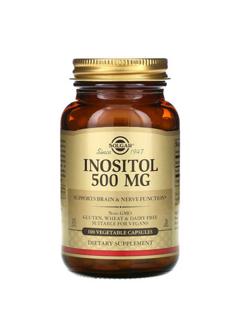 Solgar Inositol 500 mg біологічно активна речовина із групи вітамінів В. Він є складовою частиною лецитину та будівельним матеріалом для клітинних мембран. Особливості: Підтримує нервову систему Поліпшує роботу мозку Зміцнює внутрішні органи При дефіциті вітаміну В8 порушується робота нервової системи, печінки, нирок, щитовидної та підшлункової залози. Стреси, прийом медикаментів, вживання алкоголю – це фактори, які підвищують потреба організму в инозитоле. Як приймати: Приймати по 1 рослинній капсулі двічі-тричі на день, бажано під час їжі, або за призначенням лікаря. Вміст елементів у 1й порції 1 вегакапсула Вітамін В8 (інозитол) 800 мг Інгредієнти Рослинна целюлоза, рослинний магнію стеарат, рослинна стеаринова кислота, діоксид кремнію Виробник: Solgar; Форма випуску: Вегакапсули; Кількість в упаковці, шт: 100; Кількість порцій, шт: 100; Зміст порції: 1 вегакапсула; Відокремлені вітаміни: Вітамін B8; Пол: Жіночий, Чоловічий; Вікова категорія: Дорослі; Країна виробника: США; Призначення: Для мозку, Для нервової системи, Для серцево-судинної системи