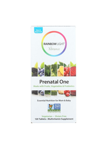 Мультивітаміни для вагітних, Prenatal One, Rainbow Light – вітамінна харчова добавка, пренатальний комплекс, який необхідно приймати жінкам під час вагітності, планування вагітності або годування груддю Розмір порції: 1 таблетка Кількість порцій: 120 Кількість на порцію % від добової потреби для вагітних та жінок, які годують груддю Вітамін A (бета-каротин) 1300 мкг 100% Вітамін C (аскорбінова кислота) 65 мг 54% Вітамін D (ергокальциферол) 15 мкг 100% Вітамін E (д - альфа тококферил сукцинат) 9.5 мг 50% Вітамін K (фітонадіон) 90 мкг 100% Тіамін (мононітрат тіаміну) 8 мг 571% Рибофлавін (вітамін B-2) 8 мг 500% Ніацин (ніацинамід) 18 мг 100% Вітамін B-6 (піридоксин гідрохлорид) 10 мг 500% Фолат (фолієва кислота) 600 мкг DFE (360 мкг фолієвої кислоти) 100% Вітамін B-12 (метилкобаламін) 9 мкг 321% Біотин 35 мкг 100% Пантотенова кислота (пантотенат кальцію) 10 мг 143% Холін (холін бітартрат) 55 мг 10% Кальцій (цитрат кальцію) 50 мг 4% Залізо (хелат амінокислоти заліза) 27 мг 100% Йод (ламінарія) 290 мкг 100% Магній (екстракт морського магнію із морської води) 50 мг 13% Цинк (цитрат цинку) 13 мг 100% Селен ( селенометіонін ) 70 мкг 100% Мідь (хелат амінокислоти міді) 1.3 мг 100% Марганець (цитрат марганцю) 2 мг 77% Хром (емплікатний комплекс хрому) 45 мкг 100% Молібден (хелат амінокислоти молібдену) 50 мкг 100% Органічна суміш райдужних суперпродуктів 125 мг * органічна спіруліна, органічний буряк, органічна броколі (рослина), органічна капуста (лист), оргнайний шпинат (листя), органічна ожина (фрукти), органічна лохина (фрукти), органічна морква (корінь), органічна журавлина (фрукти) Травна підтримка 32 мг * екстракт імбиру (кореневого) соку, амілазу (150 DU†), протеазу (600 HUT), ксиланазу (80 XU), мальтазу (4 DP), глюкоамілазу (0.4 AGU), геміцелюлазу (615 HCU), бета-глюкана ( †), фітаза (0.04 FTU), целюлаза (24 CU †), альфа-галактозидаза (4 GaIU †), ліпаза (22 FIP †), лактаза (7 ALU †), інвертаза (3 SU) ), Bacillus coagulans CC (25 млн КУО)) Цитрусові біофлавоноїди (фрукти) 25 мг * Органічна хлорела 25 мг * Інозитол 10 мг * Бор (гліцинату бору) 1 мг * * Добова потреба не визначена.