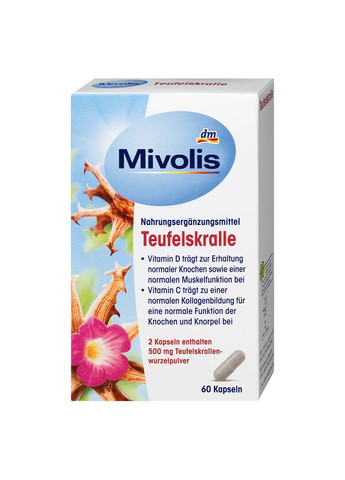 Капсули «Чортів кіготь», 35 г Mivolis Капсули «Чортів кіготь» від бренду Mivolis Харчова добавка з вітамінами та коренем чортового кігтя Вітамін D — сприяє підтримці здоров'я кісток та нормальному функціонуванню м'язів Вітамін С - сприяє правильному утворенню колагену та правильному функціонуванню хрящів і кісток Достатньо запити рідиною, ідеально з основною їжею Для нашого опорно-рухового апарату, що складається з м'язів, кісток, хрящів і сполучних тканин, необхідне достатнє постачання поживних речовин. З віком відбувається більший знос опорно-рухового апарату, що пов'язано з необхідністю належного додаткового догляду. До цього може сприяти препарат у формі капсул Mivolis Čertov pazúr. Він містить вітамін D, який сприяє підтримці здоров'я кісток і правильному функціонуванню м'язів, а також вітамін C, який сприяє правильному утворенню колагену і правильній функції хрящів і кісток. Підтримайте здоров'я свого організму капсулами від Mivolis! Властивості: Властивості продукту: без лактози, не містить глютену Важливі примітки: Не перевищувати рекомендовану добову дозу. Харчова добавка не може бути використана як замінник різноманітного та збалансованого харчування та здорового способу життя. Не підходить для дітей віком до 12 років, вагітних та жінок, що годують груддю. Зберігати в недоступному для дітей місці. Склад: Порошок з кореня чортового кігтя (Harpagophytum procumbens) 43%, мальтодекстрин, яловича желатин, L-аскорбінова кислота (вітамін С), антизлежувальний засіб: магнієві солі насичених жирних кислот, холекальциферол (вітамін D)
