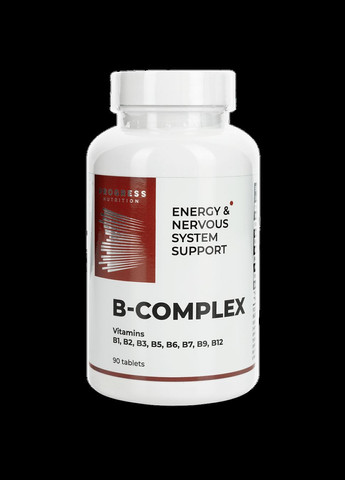 Vitamin B-Complex (Комплекс вітамінів групи B) від Progress Nutrition - це інноваційна харчова добавка, яка містить усі основні вітаміни групи B у збалансованій концентрації для підтримки вашого здоров'я та енергії кожного дня. Цей продукт стане ідеальним вибором для тих, хто прагне забезпечити організм необхідними поживними речовинами та зміцнити життєві сили. Особливості продукту Підтримка нервової системи: сприяє зниженню стресу, покращенню концентрації та настрою. Здоров'я серцево-судинної системи: допомагає нормалізувати кровообіг і роботу серця. Стимулює утворення еритроцитів: забезпечує оптимальний рівень кисню в тканинах. Регуляція метаболізму: бере участь у виробленні енергії, підтримує обмін речовин на клітинному рівні. Покращення імунітету: сприяє захисту організму від інфекцій та вірусів. Боротьба з втомою: допомагає зменшити почуття хронічної втоми, покращує фізичну та розумову активність. Кому підходить: Людям, які ведуть активний спосіб життя. Тим, хто стикається з підвищеними розумовими або фізичними навантаженнями. Під час відновлення після хвороб або стресу. Для покращення загального самопочуття та підвищення енергії. Тим, хто дотримується дієти або вегетаріанського харчування, де можливий дефіцит вітамінів групи В. Склад на 1 порцію (1 таблетка): Вітамін B1 (тіамін гідрохлорид): 40 мг – підтримує функцію нервової системи. Вітамін B2 (рибофлавін): 25 мг – сприяє здоров'ю шкіри та зору. Вітамін B3 (нікотинамід): 40 мг – покращує кровообіг і метаболізм. Вітамін B5 (кальція d-пантотенат): 50 мг – відповідає за вироблення енергії. Вітамін B6 (піридоксин гідрохлорид): 25 мг – підтримує гормональний баланс. Вітамін B7 (біотин): 1000 мкг – сприяє здоров’ю волосся, нігтів і шкіри. Вітамін B9 (фолієва кислота): 200 мкг – необхідний для кровотворення. Вітамін B10 (параамінобензойна кислота): 300 мг – покращує здоров'я шкіри. Вітамін B12 (ціанокобаламін): 100 мкг – стимулює утворення енергії та покращує пам’ять. Інші інгредієнти: Целюлоза мікрокристалічна, карбонат кальцію, магнію стеарат, діоксид кремнію, гідроксипропілметилцелюлоза. Рекомендації щодо застосування: Дорослим рекомендується приймати по 1 таблетці на день під час їжі або за рекомендацією лікаря. Регулярний прийом забезпечить ваш організм необхідними вітамінами для підтримки енергії та життєвих сил. Обираючи Progress Nutrition Vitamin B-Complex, ви обираєте комплексний підхід до свого здоров’я!