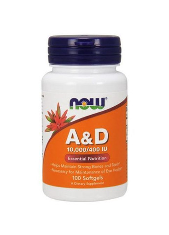 Вітамін A важливий для підтримки нормальної роботи епітелію очей, шкіри, дихальної системи, шлунково-кишкового і сечового тракту. Вітамін D покращує засвоєння кальцію і його доставку кісток. Рекомендації по застосуванню Приймати по 1 м'якій капсулі в день під час їжі або відповідно до вказівок вашого лікуючого лікаря. Інші інгредієнти Соєва олія і капсула з м'яким гелем (желатин, гліцерин, вода). Не справляється з додаванням пшеничного глютену, молока, яєць, риби або молюсків. Виробляється в установці GMP, яка обробляє інші інгредієнти, що містять ці алергени. Попередження Увага: Тільки для дорослих. Не перевищувати рекомендовану дозу. Не застосовувати препарат, якщо ви вагітні, можете завагітніти або годуєте грудьми. Проконсультуйтеся зі своїм лікарем. Крім того, проконсультуйтеся зі своїм лікарем, якщо ви приймаєте ліки або страждаєте від захворювання. Зберігати в недоступному для дітей місці. Попередження відповідно до закону Каліфорнії № 65: даний продукт містить речовину, яка за інформацією, наявною у влади штату Каліфорнія, здатна викликати вроджені дефекти або проблеми репродуктивної системи. Продукт може природним чином змінювати колір. Після відкриття упаковки зберігати в прохолодному сухому місці. Авторизований партнер NOW