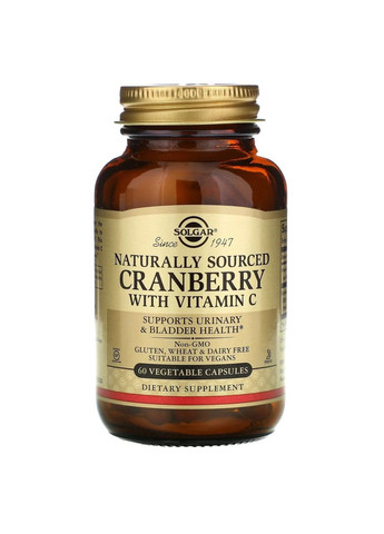 На ринку з 1947 року Сприяє хорошій роботі сечового тракту та сечового міхура Не містить глютену, пшениці та молочних продуктів Підходить для вегетаріанців Харчова добавка Кошерний продукт/парве Журавлина допомагає зберігати цілісність стінок сечового міхура, сприяючи хорошій роботі сечової системи. Цей продукт також містить вітамін С, що підтримує імунітет. Solgar natural cranberry виготовляється з натуральної журавлини. Рекомендації щодо застосування Як харчову добавку для дорослих приймайте 1 (одну) капсулу в рослинній оболонці двічі на день, бажано з їжею або за призначенням лікаря. Інші інгредієнти Рослинна целюлоза, кремнезем, рослинний стеарат магнію. Без: клейковини, пшениці, молочних продуктів, сої, дріжджів, цукру, натрію, штучного ароматизатора, підсолоджувача, консервантів і кольору. Попередження У разі вагітності, годування груддю, вживання будь-яких ліків або наявності захворювань, проконсультуйтеся з лікарем перед прийомом будь-яких харчових добавок. Припиніть використання і проконсультуйтеся з лікарем у разі появи будь-яких побічних ефектів. Зберігати в недоступному для дітей місці. Зберігати за кімнатної температури. Не використовуйте, якщо зовнішня мембрана відсутня, розірвана або пошкоджена. Склад Розмір порції: 1 капсула для овочів Кількість на порцію % від добової потреби Вітамін С (як L-аскорбінова кислота) 60 мг 100% Журавлина (концентрат 50:1) (фрукти) (макрокарпон вакцини) 400 мг ** ** Добова величина (DV) не встановлена.