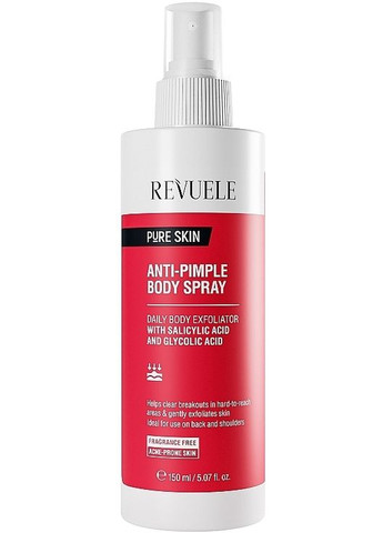 Спрей для тіла від бренда Revuele – функціональний доглядовий засіб, що очищує, живить, зволожує і оберігає шкіру від негативного впливу зовнішніх факторів, чудово адаптуючись до потреб усіх її типів. Оксамитова консистенція утворює на поверхні епідермісу невагомий захисний «щит», що блокує агресію довкілля, бореться з патогенними мікроорганізмами, дрібними недоліками та дискомфортом, що вони викликають. Pure Skin Anti-Pimple Body Spray регулює секрецію, розчиняє вміст забитих пор, пришвидшує їхнє звуження, тим самим вирівнюючи рельєф і відтінок шкіри, схильної до утворення чорних цяток, акне, інших недосконалостей. Особливості Pure Skin Anti-Pimple Body Spray від Revuele: - делікатно позбавляє тіло від різноманітних забруднень;- оберігає його від негативного впливу зовнішніх факторів;- розчиняє сальні пробки, чорні цятки, вміст забитих пор;- пришвидшує їхнє звуження, зменшує видимість, матує;- надлегка консистенція рівномірно розпилюється, швидко всотується;- не залишає липкої плівки чи жирного блиску;- дбайливо підсушує прищі, перешкоджаючи їхній повторній появі;- виготовлений на основі з молочної, гліколевої, яблучної, лимонної, саліцилової кислот;- сприяє відлущенню ороговілого шару, омертвілих клітин;- помітно вирівнює відтінок, розгладжує рельєф епідермісу;- ніацинамід позбавляє його тьмяності та пігментації;- вітамін Е вражає сильними антиоксидантними властивостями;- протидіє вільним радикалам – провісникам фотостаріння;- екстракт листя барбадоського алое вера нормалізує і підтримує гідробаланс;- перешкоджає трансепідермальній втраті води;- активно бореться з наявними ознаками дегідратації;- мінімізує ризик утворенню сухості, лущень, подразнень, почервонінь;- регулює секрецію, прибираючи надлишки себуму;- оптимальний для лікування і профілактики акне.