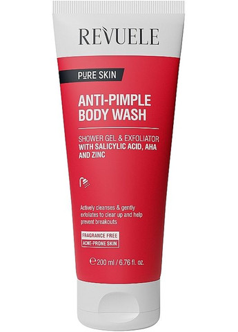 Очищувальний засіб для тіла проти прищів бренда Revuele — ефективний косметичний продукт, який допоможе позбутися неприємних вугрів і звузити пори. Фахівці болгарського бренда Revuele спеціалізуються на виготовленні косметики для догляду за шкірою. Особливості Revuele Pure Skin Anti-Pimple Body Wash: - покращує колір і текстуру шкіри, зменшує пігментацію та запалення, стимулює синтез колагену та еластину завдяки вітаміну В3;- містить екстракт кореня реп’яху, який забезпечує протизапальну, антисептичну, загоювальну та регенерувальну дії, бореться з прищами та іншими проблемами шкіри;- покращує мікроциркуляцію крові, зміцнює судини, стимулює обмін речовин завдяки вмісту екстракту листя крес-салату;- збагачений екстрактом листя шавлії , який регулює роботу сальних залоз, знімає подразнення і свербіж, покращує тонус та еластичність епідермісу;- містить комплекс цинку та пірролідонкарбонової кислоти, який нормалізує роботу сальних залоз, зменшує жирність і запалення шкірного покриву, покращує його структуру;- прискорює процес оновлення шкіри, вирівнює її тон і текстуру, зменшує рубці та пост-акне.
