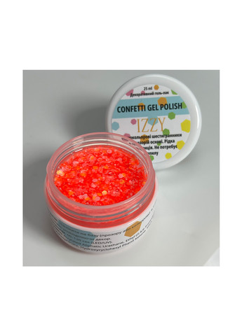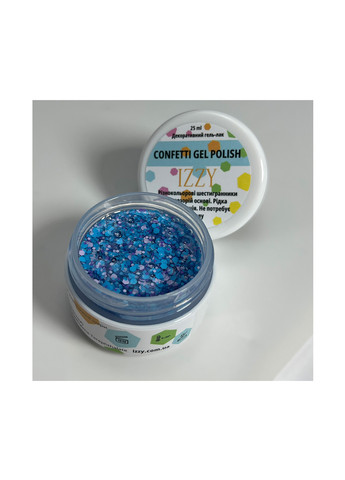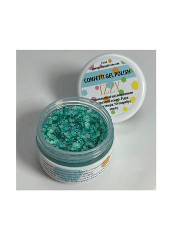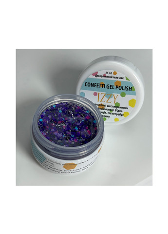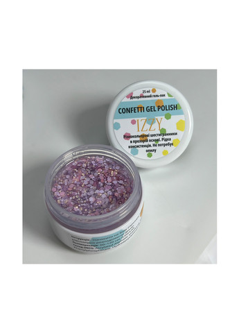 Гель-лак ІЗЗІ Конфетті - це гель-лак із шестигранками різного розміру та кольору всередині прозорої основи. Декор складається із спеціального матеріалу, який не вступає в реакцію з основою, за рахунок чого не змінює колір і не забарвлює основу. В основу гель-лаку додані стабілізатори, за рахунок чого декор не осідає на дно. Сфера використання таких декоративних гель-лаків доволі широка. Їх можна використовувати стандартним способом - наносити на прозорий фон та покривати прозорим топом. Ще один з цікавих способів - покривати їх камуфлюючими кольоровими топами. Для яскравого дизайну декоративні гелі можна покривати вітражними гель-лаками, які будуть давати напівпрозорий ефект, де шестигранки під ним будуть створювати обємний дизайн. Спосіб нанесення: нігті підготувати до покриття стандартним методом, нанести та полімеризувати базу. Декоративний гель-лак для манікюру IZZY Confetti нанести в один або два вирівнюючі шари. Для цього можна скористатися пензликом для гелю, або використовувати звичайний пензлик для гель-лаку. Гель-лак добре вирівнюється та не потребує опилу. Полімеризувати від 60 до 120 сек., в залежності від потужності лампи та товщини шару. При потужності 48Вт вистачає 60сек для повного просихання. Далі вже можна покривати вітражним гель-лаком, прозорим або камуфлюючим топом.