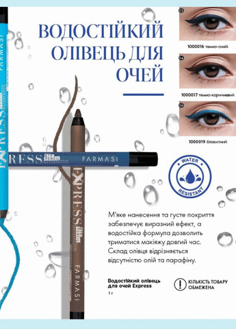 Стримані стрілочки чи яскраво сміливий погляд? Будь-яка фантазія може бути реалізована за допомогою нового водостійкого олівця для очей Exspress. Цей професійний інструмент має дві особливості: підвищену стійкість до води та м'яку текстуру, яка не шкодить навіть найчутливішій шкірі. Багата палітра відтінків дозволяє вибрати олівець для будь-якого випадку і макіяжу. Надзвичайно м'яке нанесення та щільне покриття забезпечує виразні ефекти. Склад олівця порадує відсутністю олії та парафіну. Крім розкішного кольору олівці дарують шкірі повік зволоження та захист: антиоксиданти у поєднанні з вітаміном Е доглядають та оберігають повіки від шкідливого впливу навколишнього середовища. Без консервантів. Стійкість протягом 12 годин. Водостійка формула. Металеві та матові кольори. М'які текстури. Склад: Ісододекан, Synthetic Wax, Hydrogenated Polydicyclopentadiene, PEG/PPG-18/18 Dimethicone, Polybutene, Glyceryl Tribehenate/Isostearate/Eicosandioate, Nylon-12, Polyethylene, Perfluorononyl Dimeico / Sebacate, Synthetic Beeswax, Pentaerythrityl Tetra-Di-T-Butyl Hydroxyhydrocinnamate, Copernicia Cerifera Cera, Mica, CI 77891, CI 42090.