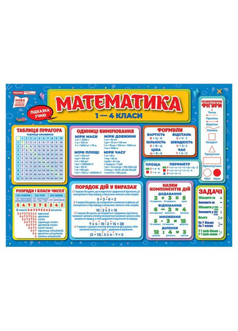 Учителям початкових класів важливо навчити дитину самостійно виконувати вправи, задачі. Надійним помічником для цього є підкладка-підказка для учнів 1-4 класів з математики. Вона містить весь курс математики у початковій школі: таблицю Піфагора одиниці вимірювання формули геометричні фігури розряди й класи чисел порядок дій у виразах назви компонентів дій задачі (зменшити/збільшити) особливі випадки множення/ділення дроби ознаки подільності чисел розв’язування рівнянь половина, третина, четвертина знаки порівняння цифри Дитина може користуватися цією пам’яткою під час занять, так і вдома, при виконанні домашніх завдань. Розміщуємо наочність перед очима школяра, на столі чи парті, щоб можна було швидко і легко знайти необхідну інформацію. Килимок-підказка може стати у пригоді й батькам, які допомагають своїм чадам опанувати шкільну програму. Планшет-підказка двосторонній. Надрукований на цупкому якісному картоні. Має захисне матове покриття, яке не відблискує при попаданні світла і прямих сонячних променів, береже дитячий зір.