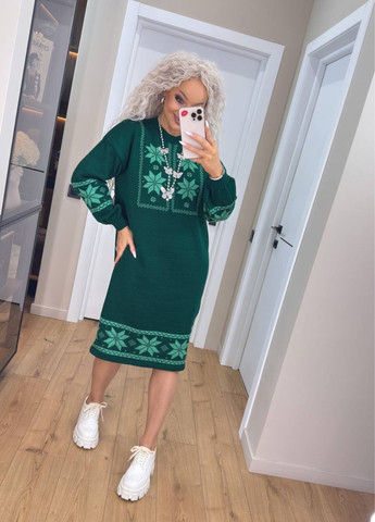 В’язана сукня до коліна з етнічним мотивом поєднує сучасний стиль і традиційне натхнення вишиванки. Модель вільного крою виготовлена з м’якого матеріалу на основі акрилу та вовни, що робить її теплою, але приємною на дотик і легкою для носіння. Ідеальний вибір для прохолодної осені та зими, вона створює комфортний і водночас стильний образ.