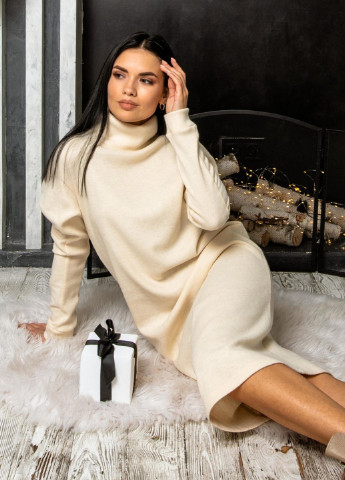 В'язана сукня міді з високим коміром. Тканина: пряжа акрил. Універсальний розмір. Ідеальний вибір для дівчат, які обожнюють комфорт. Опущені пройми, довгі широкі рукави і прямий низ закінчуються в'язкою у вигляді манжетів. Заміри: Довжина виробу: 105см; Обхват грудей та стегон: 110см (тягнеться).