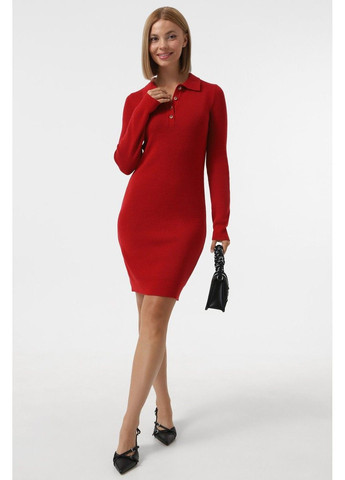 В'язана сукня виконана з нитки із вмістом еластану, що забезпечує додатковий комфорт та запобігає небажаному розтягуванню. Силует вільний і прямий, але рельєфи створюють додатковий жіночий силует і прикрашають сукню. Класичне виконання коміра на планці з ґудзиками перетворює цю модель сукні на сучасну базову річ гардеробу. Модель має довгий рукав.