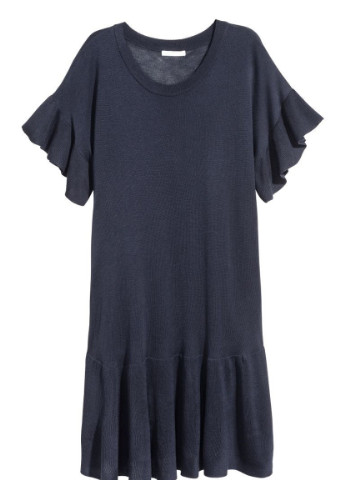 Коротка пряма сукня з тонкої трикотажної тканини з легким блиском з м'якої віскози. Короткі рукави з воланами внизу і широкий волан по подолу сукні. Без підкладки. У виробі можливе пошкодження бирки.