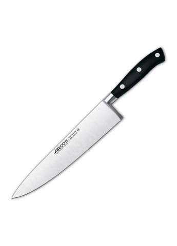 Ніж поварський серії Riviera Arcos – багатофункціональний шеф-ніж, підходить для шаткування овочів та фруктів, обробки, нарізання м’яса та риби та інших робіт. Серію кованих ножів Arcos Riviera розробили для професійного та домашнього використання. Лезо ножа шеф-повара виготовили з ексклюзивної нержавіючої сталі NITRUM, що має надвисоку ріжучу здатність, підвищену твердість та корозостійкість. У результаті лезо поварського ножа довго не затуплюється, не ржавіє, тому виріб має довгий термін служби, забезпечуючи економічну ефективність інвентарю. Захистом для пальців під час нарізання служить особлива конструкція п’ятки, що розміщена на кінці леза та робить використання ножа безпечним та надійним. Руків'я шеф-ножів серії Riviera з витонченим дизайном виготовили з поліоксиметиленових накладок, які не створюють щілин та запобігають проникненню мікроскопічних елементів їжі. Закріплюють конструкцію руків'я ножів arcos міцні металеві заклепки, що сприяють довготривалій роботі з ножем на кухні. Больстер розташовується на передній частині руків'я ножа та зменшує навантаження на руку повара під час нарізання. Руків'я шеф-ножа пройшла антибактеріальну обробку, стійка до кислот, хлору, миючих засобів та високих температур. Догляд за кухонними ножами Arco Мийте кухонні ножі відразу після використання Після експлуатації протирайте насухо кухонні ножі м'якою тканиною Рекомендуємо нарізати на дерев'яній або пластиковій дошці По можливості ножі для кухні мийте вручну Для заточки ножів регулярно правте кухонні ножі за допомогою мусатів Arcos Зберігайте кухонні ножі в сухому, недоступному для дітей місці Які ножі входять в серію Arcos Riviera До колекції увійшли ножі для обробки м’яса, ніж обвалювальний, ніж філейний, а також шеф-ножі, японські ножі, ножі Сантоку, поварські ножі, ножі для овочів та фруктів, ножі для чищення овочів, ножі для нарізки, ножі для томатів, ножі для риби, ножі для хліба, ножі для хамону, ножі для сиру. Тип ножів Arcos Riviera Ножі Arcos серії Riviera виготовили методом гарячого кування з екологічно чистої нержавіючої сталі NITRUM. Вуглецеву сталь спочатку нагрівають, а потім кують, надаючи форму професійному ножу. Кухонні ножі згодом охолоджують азотом, термічно обробляють, шліфують і полірують. На кінцевому етапі вставляють руків'я. Готові ковані ножі не мають небажаних зварних швів, склеєних або порожніх ділянок. Натомість ножам виготовленим методом гарячого кування характерна висока механічна міцність, стійкість до поломок та окислень. Матеріал клинка (леза) ножів Arcos Riviera Лезо ножів Arcos виготовляють із запатентованої сталі NITRUM, поєднуючи інноваційні матеріали для клинка кухонного ножа. Неперевершену гостроту леза створюють за технологією «шовковий край». Саме вона дозволила досягти в кінцевому рахунку ідеальної гостроти ножа і тривалої ріжучої здатності. Клинок зі сталі NITRUM зберігає привабливий зовнішній вигляд під час всього періоду експлуатації, йому характерна стійкість до корозії, довговічність у процесі постійного використання. Матеріал руків'я ножів Arcos серії Riviera Руків'я ножів виготовляють з пластичного поліоксиметилену та прикріплюють до хвостовика нержавіючими заклепками. Матеріал стійкий до ударів, кислот, хлору, миючих засобів, грибків та плісняви. Не потрапляють залишки їжі завдяки повній відсутності пустот. Руків'я ножів Arcos 