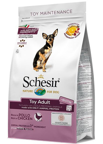Schesir Dog Toy Adult – повноцінний збалансований раціон для собак міні порід, що складається з натуральних інгредієнтів з додаванням комплексу вітамінів та мінералів, необхідних для здоров'я та довголіття вашого вихованця. З високим вмістом м'яса курки без додавання інших джерел тваринного білка – монопротеїнова формула. Даний корм рекомендується для собак віком від 1 до 7 років.