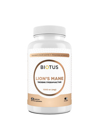 Lion's Mane, Biotus – це високоякісна харчова добавка, що містить 1000 мг гриба Lion's Mane на порцію (2 капсули) Рекомендована добова доза: 2 капсули Кількість на порцію (2 капсули) Їжовие гребінчастий 1000 мг