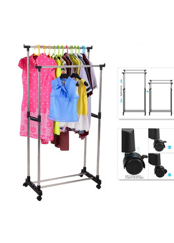 Зручна та досить велика стійка для одягу Double Pole має розміри - 130х66х30 см. Стійка повністю збірна, і її можна подовжити і зробити вище, або зробити вже або нижче. Трубки стійки Double Pole виготовлені з алюмінію, покриті захисною фарбою оливкового кольору, порожнисті всередині, тому стійка навіть у збірці важитиме не більше 1,5 кг. Пластикові заглушки на кінцях труб, що випирають, зібраної конструкції, захистять одяг і запобігають випадковому падінню одягу якщо він буде просто накинутий на стійку. Стійка Double Pole виконана двоповерховою, для впорядкування і нормального, компактного, розміщення одягу на ній. Бічні поперечні планки зручні для розміщення на них, наприклад, випрасуваних штанів. Найкраще для стійки використовувати вішалки, так що одягу можна розмістити в рази більше. Переваги стійки для одягу Double Pole: Досить габаритна для розміщення більшої кількості одягу; Компактна, у глибину, для збереження простору; Має легку вагу; Легка та досить швидка збірка; Не потребує використання додаткових інструментів (тільки руки); Завдяки коліщаткам - легко транспортується навіть завантаженою; Подвійна стійка; Поперечні невеликі перекладини; У нижній частині стійки – невелика поличка для взуття; Пластикові заглушки на труби. Комплектація стійки для одягу Double Pole: 6 великих труб діаметром 25 мм; 4 середніх труб, діаметром 22 мм; 2 малі труби, діаметром 19 мм; 6 маленьких коротких трубочок, діаметром 22 мм; 2 ніжки-стійки (пластикові); 8 Т-подібних кріплень; 4 заглушки; Габаритні розміри: Ширина: 66 см. Глибина: 30 см. Висота: 130 см. Вага: 1,5 кг.