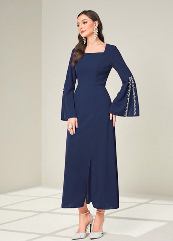 Ця довга сукня має квадратний виріз та деталі із перлинними заклепками. Модель має стандартний крій, високу талію та розріз по краю для зручності рухів. Рукави довгі, з розкльошеною манжетою. Ця сукня, виготовлена з злегка еластичної тканини, зручно носити протягом усього дня.