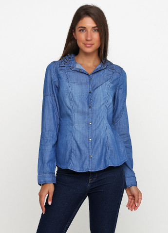 Сорочка застібається на кнопки, декорована металевими заклепками. На розмір 38 довжина виробу по спинці: 60 см, довжина рукава: 62 см.