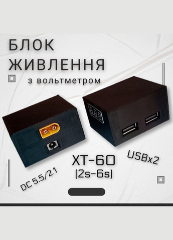 Блок живлення 2×USB / XT60 / DC з вольтметром (5V, QC) Багатофункціональний перетворювач, який дозволяє використовувати FPV-акумулятор або зовнішнє джерело живлення як повноцінний павербанк з підтримкою швидкої зарядки. Особливості: Живлення від акумулятора з роз'ємом XT60 або зовнішнього DC-джерела 5.5×2.1 мм (вхідна напруга: 6–32 В) Сумісний з акумуляторами 2S–6S (7.4–25.2 В) Два USB-порти — можливість одночасної зарядки двох пристроїв Вбудований вольтметр для контролю напруги батареї в режимі реального часу Вихідні характеристики: Потужність до 24 Вт Вихід: 5 В / 3.4 А, 9 В / 2.5 А, 12 В / 2 А тощо ККД: 90% – 97% Захист та безпека: Захист від перегріву Захист від короткого замикання Захист від перевантаження по струму Стійкість до перепадів вхідної напруги Підтримувані протоколи швидкої зарядки: Qualcomm QC 2.0 / QC 3.0 DCP, BC1.2, Apple, Samsung AFC Huawei FCP / SCP Spreadtrum SFCP MTK PE 1.1 / PE 2.0 Ідеальне рішення для FPV, технічних завдань, виїзної роботи та автономного живлення пристроїв у польових умовах.