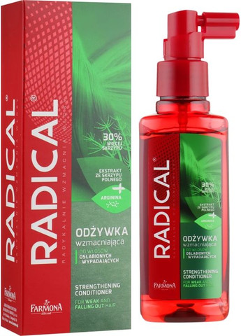 Втратити життєву силу волосся може з різних причин: стреси, стан здоров'я, погана екологія, часті укладання термоприладами, проведення процедур фарбування і хімічної завивки — і це ще не повний список. Як би там не було, проблему не можна пускати самопливом — потрібно якомога раніше почати діяти! Ви готові вступити в боротьбу за розкішне, густе волосся? Кондиціонер зміцнювальний для ослабленого волосся від польського бренда Farmona стане надійним помічником у цьому! Збагачена екстрактом хвоща, кофеїном, аргініном і пантенолом формула швидко покращить стан локонів, подарувавши їм здоровий вигляд і збільшивши об’єм. Особливості Radical Strengthening Hair Conditioner від бренда Farmona: - наявність дозатора на флаконі дає змогу контролювати витрачання засобу;- консистенція оптимальної густоти забезпечує рівномірне розподілення по волоссю;- забезпечує потужну зволожувальну і живильну дії;- розгладжує волосяні лусочки і запобігає появі посічених кінчиків;- відновлює пошкоджені ділянки локонів по всій довжині;- зміцнює пасма, роблячи їх менш вразливими до впливу різних зовнішніх факторів;- надає волоссю м'якості та живого блиску;- ущільнює локони.