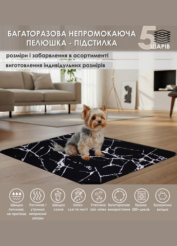 Багаторазові пелюшки для собак: 5 шарів надійного захисту та комфорту Забудьте про одноразові пелюшки! Представляємо вам багаторазові пелюшки для собак, які стануть екологічною та економічною альтернативою. Завдяки своїй п'ятишаровій структурі, ці пелюшки забезпечують неперевершений захист від протікань, швидко поглинають рідину та утримують неприємні запахи, зберігаючи чистоту у вашому домі. Основні переваги: * 5 шарів захисту: - Верхній шар: 100% бавовна, приємний на дотик матеріал, що швидко пропускає вологу. - Другий шар: Поглинаючий шар, який ефективно утримує рідину. - Третій шар: Додатковий поглинаючий шар для максимального захисту від протікань. - Четвертий шар: Полієфірна тканина, що утримує неприємні запахи - П'ятий шар: Водонепроникна мембрана, що запобігає потраплянню рідини на підлогу. * Багаторазове використання: Можна прати в пральній машині, що робить їх економічно вигідними та екологічно дружніми. * Відмінне поглинання: Ефективно вбирають вологу та нейтралізують неприємні запахи. * Універсальність: Підходять для цуценят під час привчання до туалету, для літніх або хворих собак з нетриманням, для захисту меблів, а також для використання в переносках та автомобілях. * Легкий догляд: Швидко сохнуть після прання. * Різні розміри: Доступні в різних розмірах та забарвленнях, що підходять для собак будь-яких порід. Є можливість виготовлення за Вашими розмірами Ідеально підходять для: * Для пологів * Привчання цуценят до туалету. * Собак з нетриманням сечі. * Захисту меблів та підлоги. * Використання в переносках, клітках, манежах та під час подорожей в авто. * Створення гігієнічного місця для вашого улюбленця. Інструкції з догляду: * Прання в пральній машині при низькій температурі до 30 °C * Використовувати м'які миючі засоби. * Не використовувати відбілювачі, та хлорвмісні засоби * Віджим до 700 обертів * Сушити при низькій температурі або на повітрі. * Не прасувати. Витримують понад 300 циклів прання Подбайте про чистоту та комфорт вашого улюбленця з нашими багаторазовими 5-шаровими пелюшками!