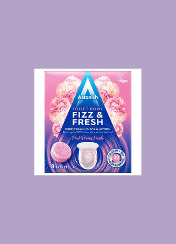 Таблетки для унітазу проти вапняного нальоту, кальцію та іржі з ароматом півонії Astonish Toilet Bowl Fizz Fresh Pink Peony Fresh, 8 шт. Опис Таблетки для унітазу Astonish Toilet Bowl Fizz Fresh Pink Peony Fresh призначені для глибокого очищення унітазу та видалення вапняного нальоту, кальцію та іржі. Завдяки активній формулі та квітковому аромату півонії, таблетки забезпечують глибоку чистоту та приємний свіжий запах після кожного використання. Основні характеристики: Інтенсивне очищення – ефективно видаляють вапняний наліт, кальцій та іржу, зберігаючи блиск поверхонь Освіжаючий аромат півонії – дарує приємний квітковий запах, наповнюючи ванну кімнату свіжістю Легкість використання – таблетки шиплять та швидко розчиняються у воді, діючи навіть у важкодоступних місцях Захист від нальоту та іржі – регулярне використання допомагає запобігти утворенню нових забруднень Рекомендації щодо використання: Опустіть одну таблетку в унітаз Залиште на 10-15 хвилин, щоб активні компоненти подіяли Після закінчення часу змийте воду Для сильних забруднень використовуйте щітку для унітазу Рекомендується застосовувати 1-2 рази на тиждень для підтримання чистоти Запобіжні заходи: Зберігайте таблетки у сухому місці, недоступному для дітей Уникайте потрапляння на шкіру та в очі; у разі контакту – промийте великою кількістю води Не ковтайте, у разі випадкового проковтування негайно зверніться до лікаря Дотримуйтесь інструкцій на упаковці Astonish Toilet Bowl Fizz Fresh Pink Peony Fresh – це надійний засіб для підтримання гігієнічної чистоти та свіжості вашого унітазу з приємним ароматом півонії!