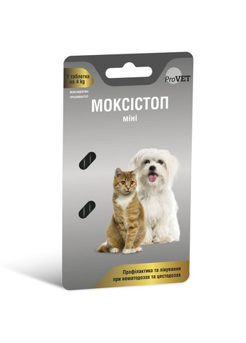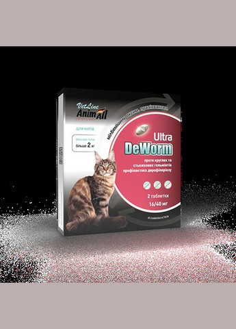 АнімАлл ВетЛайн ДеВорм Ультра для котів, від 2 кг, 2 табСклад400 мг препарату містить діючу речовину:мільбеміцин оксим – 16,0 мг;празиквантел – 40,0 мг.Допоміжні речовини: : мікрокристалічна целюлоза, моногідрат лактози, повідон, кроскармелоза натрію, кремній колоїдний безводний, магнію стеарат, м'ясний ароматизатор.Фармакологічні властивостіATC-vet QP534, ендектоциди (QP54АВ51, мільбеміцин, комбінації). Таблетки Деворм Ультра для котів та кошенят відносяться до групи ендетоцидів, що містять дві активні діючі речовини. Таблетки належать до групі комбінованих антигельмінтних препаратів нематодоцидної та цестодоцидної дії. Активні компоненти, що входять до складу препарату, забезпечують його широкий спектр антигельмінтної дії. Мільбеміцина оксим - макроциклічний лактон, що отримується в результаті ферментативної діяльності Streptomyces hygroscopicus var. Aureolacrimosus, активний відносно личинок і імаго нематод, паразитуючих в шлунково-кишковому тракті котів, а також личинок Dirofilaria immitis.Механізм дії мільбеміцина обумовлений підвищенням проникності клітинних мембран для іонів хлору (Cl-), що призводить до надмірної полярізації мембран клітин нервової і м'язової тканини, паралічу і загибелі паразита. Максимальна концентрація мільбеміцина оксима в плазмі крові тварини досягається протягом 2-4 годин, біодоступність становить близько 80%. З організму виводиться в основному в незмінному вигляді. Празиквантел є ацильованим похідним піразинізохіноліна, володіє вираженою дією проти цестод і нематод. Підвищуючи проникність клітинних мембран паразита для іонів кальцію (Ca2 +), викликає деполяризацію мембран, скорочення мускулатури і руйнування тегумента, що призводить до загибелі паразита і сприяє його виведенню з організму тварини. Максимальна концентрація празиквантель в плазмі крові тварин досягається через 1-4 години. Він піддається швидкій і практично повній біотрансформації в печінці. Рівень зв'язування в плазмі становить близько 80%, виводиться з організму протягом 2 діб в основному з сечею. Таблетки для котів та кошенят за ступенем впливу на організм відносяться до речовин малонебезпечних, в рекомендованих дозах не надають сенсибілізуючу, ембріотоксичну і тератогенну дії, добре переносяться котами різних порід і віку. Препарат токсичний для бджіл, а також риб і інших гідробіонтів.Застосування Таблетки призначають для профілактики та дегельмінтизації при захворюваннях, викликаних як личинковими формами, так і статевозрілими цестодами - Dipylidium caninum, Taenia spp., Echinococcus spp. та нематодами – Ancylostoma tubaeforme, Toxocara cati, Dirofilaria immitis (профілактика захворювання), в т.ч. при нематодозах, цестодозах, комбінованих нематодо-цестодозних інвазіях.Дозування Препарат застосовують кішкам одноразово під час годування з невеликою кількістю корму або вводять примусово на корінь язика після годування в мінімальній терапевтичній дозі, з 2 мг мильбеміцину оксиму та 5 мг празиквантелу на 1 кг маси тварини, з розрахунку: Вага таблетки, мг 400 мг, Маса тіла тварини, 2,0 - 4,0 кг Кількість таблеток - 1/2 табл Вага таблетки, мг 400 мг, Маса тіла тварини, 4,0 - 8,0 кг Кількість таблеток - 1 табл Вага таблетки, мг 400 мг, Маса тіла тварини, 8,0 - 12,0 кг Кількість таблеток - 1 та 1/2 табл Попередньої голодної дієти і застосування послаблюючих засобів перед дегельмінтизацією не вимагається. Профілактика тварин зазвичай 1 