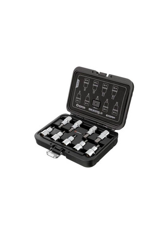 Призначення Набір біт HEX у тримачі призначений для монтажу та демонтажу кріплень із типом шліца: H4, H5, H6, H7, H8, H10, H12, H14, H17. Цей комплект змінних біт підходить для використання спільно з тріскачними ручками та тримачами, з посадковим квадратом 1/2". Всі головки мають спеціальні насічки, які покращують зчеплення з долонею в рукавичці або з забрудненою в змащуванні руці. Матеріал виготовлення Біти виготовлені з топової загартованої сталі, найвищої якості марки S2. У складі цієї сталі є молібден і кремній, які надають виробу високий опір до навантажень і низький поріг оборотної деформації. Самі головки виготовлені з міцної Cr-V сталі, таке поєднання робить насадки надійними, міцними інструментами з великим ресурсом роботи. Кейс весь набір поміщений у міцний пластиковий кейс із металевими засувками, стильного дизайну серії STORM. Металеві замки вбережуть кейс від випадкового відкриття. Ящик легко переносити та зберігати, він компактний і не займає багато місця. Комплектація Біти в головках 1/2": H4, H5, H6, H7, H8, H10, H12, H14, H17. Кількість одиниць у наборі: 9 од.; Шестигранник: H4-H17; Довжина шестигранника: 55 мм; Квадрат: 1/2"