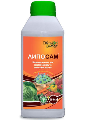 Прилипач Липосам – це просторова конфігурація макромолекул біополімерів, що утворює на листовій поверхні мікроскопічну сіточку, яка м’яко обгортає рослину, зберігаючи її вологу та не заважаючи росту та розвитку рослини. Для утворення сіточки і її фіксації на рослині Липосаму достатньо 15-30 хв. • Передпосівна обробка насіння: 5 мл / 500 мл води. • Замочування коріння розсади перед садінням: 50-100 шт 5-10 мл / 5-10 л води. • Обприскування по листу: 5-10 мл /10 л води. За рахунок еластичної біополімерної сіточки Липосам: • Закріплює ЗЗР на поверхні листка та запобігає їх втратам. • Знімає поверхневий натяг і змінює в'язкість розчину, сприяючи надходженню діючої речовини в рослину. • Зберігає восковий шар листка. • Захищає рослину від сонячних опіків. • Стримує надмірне випаровування вологи. • Закріплення ЗЗР на листку. Застосування Липосаму як прилипача сприяє утриманню і пролонгації дії ЗЗР на поверхні рослин до 20–30 днів. Через краще розтікання розчину по поверхні листя, діюча речовина якісно фіксується на поверхні незалежно, чи вона гладенька, чи опушена. Це явище відбувається завдяки екзополісахариду, який складає основу препарату. Специфічна розгалужена структура полісахариду дозволяє йому закріплюватись на поверхні рослини, а наявність активних функціональних груп забезпечує фіксацію та утримання ЗЗР і поживних елементів добрив у безпосередньому контакті з клітинами рослинного організму, запобігаючи їхньому змиванню і сприяючи подовженню їх впливу.