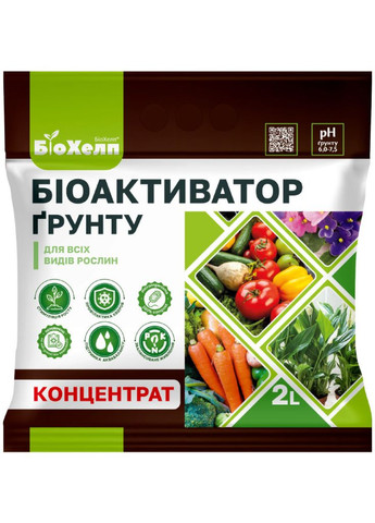 Біоактиватор ґрунту для приготування ґрунтосумішей, для підживлення розсади, кімнатних рослин, для покращення ґрунту та торфу при посадці різних рослин. Покращує зростання та розвиток рослин. Покращує приживаність, відновлює корисну мікрофлору, покращує структуру ґрунту та підвищує її родючість, утримує вологу у ґрунті, підвищує стійкість рослин до бактеріальних та грибних захворювань. При приготуванні ґрунтосуміші для висіву насіння на розсаду: 0,1-0,2 л біоактиватора на 1 л ґрунту або торфу. При підживленні кімнатних квітів біоактиватор посипають під рослину рівномірно розсипаючи поверхнею грунту шаром 1 див. Овочі л/м2: 1,0-2,0. Квіти та садові кущі л/м2: 0,6-2,0. Фруктові дерева та чагарники при посадці – 2 л/саджанець: 1 л на дно ями + 1 л у суміш із землею. Призначення: • для приготування грунтосуміші. • для підживлення кімнатних кольорів. • для покращення ґрунту та торфу при посадці розсади овочів, саджанців кущів та дерев. • для весняного та літнього підживлення вегетуючих рослин, як поверхнево, так і в лунки. • для осіннього обробітку ґрунту. • мульчування антисептичного матеріалу. Переваги: • посилює зростання та розвиток кореневої системи та наземної маси рослин. • забезпечує збалансоване харчування всіх сільськогосподарських культур. • створює умови для одержання екологічно безпечної продукції. • відновлює корисну та інгібує шкідливу мікрофлору. • підвищує стійкість рослин до бактеріальних та грибних захворювань (фітофторозу, парші, кореневої гнилі, фузаріозу та ін.). • відновлює оптимальну кислотність ґрунту при регулярному використанні. • покращує структуру ґрунту та підвищує його родючість. • утримує вологу у ґрунті.