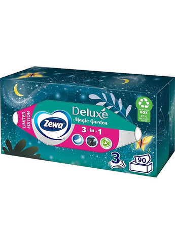 Паперові серветки в коробках Zewa Deluxe – новий великий сімейний формат! Серветки в коробках – зручний формат, що завжди під рукою, якщо потрібно швидко впоратися з незграбними ситуаціями. Серветки Zewa Deluxe не тільки м’які та дбають про чутливу шкіру, а ще й міцні та здатні витримати навіть випадкове машинне прання.* У складі серветок тільки 100% сертифікована целюллоза FSC. * За результатами дослідження Eurofins Evic (Еврофінс ЕВІКЕМ), Франція, квітень 2018 р