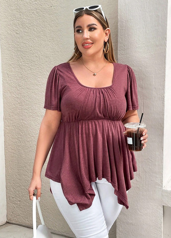 Ця жіноча повсякденна футболка великого розміру має трикотажну тканину з коротким рукавом з воланами, асиметричними оборками та квадратним вирізом.