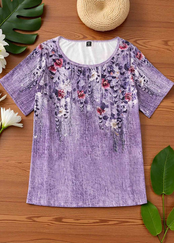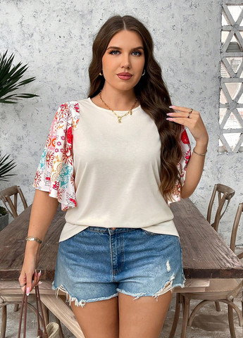 Жіноча футболка з короткими рукавами SHEIN LUNE великих розмірів. З круглим вирізом та рукавами-воланами. Низ стандартної форми та рослинний візерунок. Повсякденний фасон. Класичний крій, тканина трохи тягнеться. Прати в пральній машині з м'яким миючим засобом; не піддавати хімчистці.